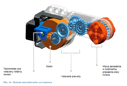 Pohyb robota je zabezpečený vďaka dvom / trom interaktívnych servomotorov (Obr. 15). Otočná časť sa môže pohybovať rýchlo, ale aj pomaly, vďaka sústave ôsmych prevodových kolies (Obr. 16). Súčasťou servomotoru je enkóder – rotačný senzor. Meria počet celých otáčok, prípadne otočenie motoru v stupňoch.