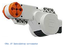 Pohyb robota je zabezpečený vďaka dvom / trom interaktívnych servomotorov (Obr. 15). Otočná časť sa môže pohybovať rýchlo, ale aj pomaly, vďaka sústave ôsmych prevodových kolies (Obr. 16). Súčasťou servomotoru je enkóder – rotačný senzor. Meria počet celých otáčok, prípadne otočenie motoru v stupňoch.